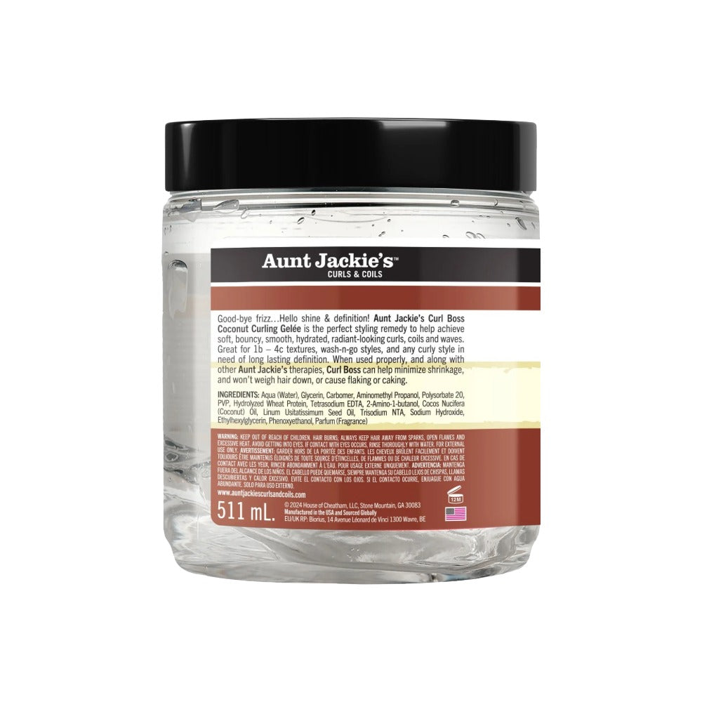 - Aunt Jackie’s Curl Boss Coconut Curling Gelée is the perfect styling remedy for help achieve soft, bouncy, smooth, hydrated, radiant-looking curls, coils and waves.